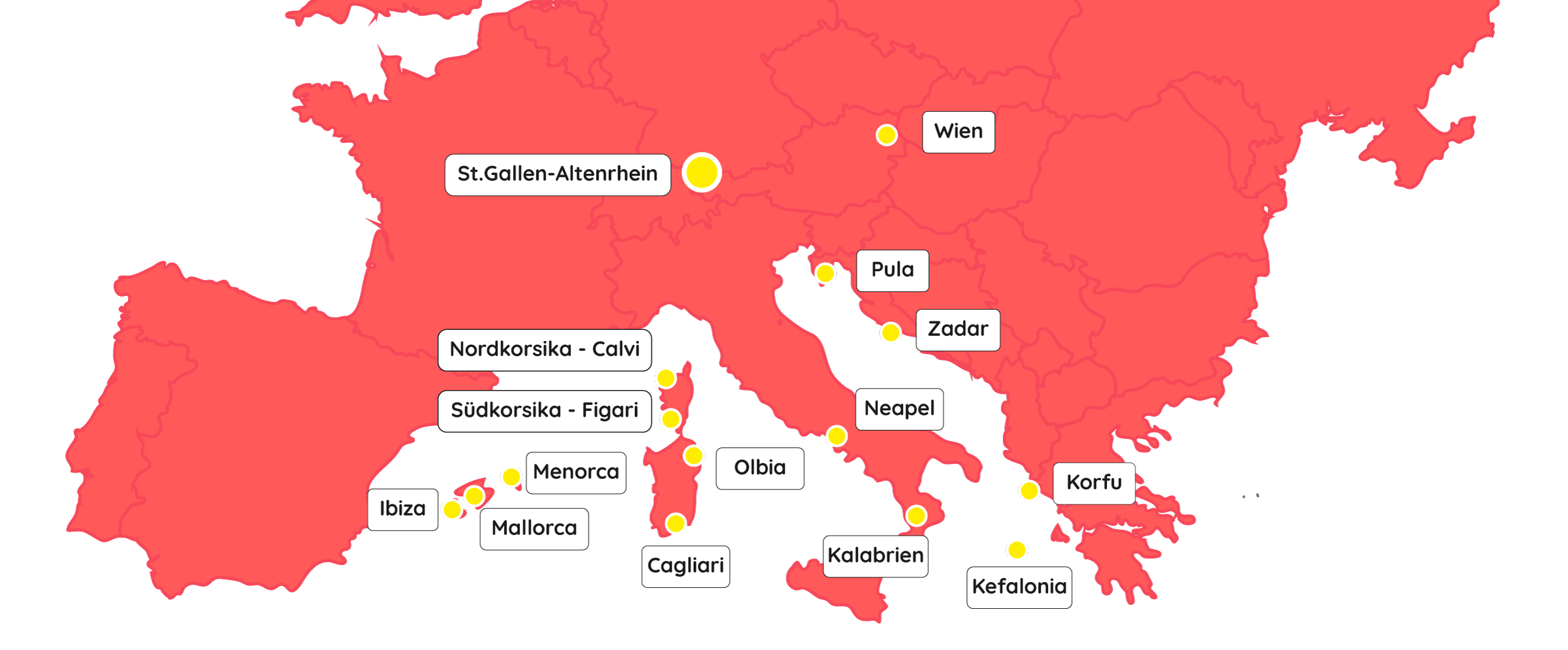 Flüge bis zu 4 Mal täglich zwischen St.Gallen-Altenrhein und Wien und in den Sommermonaten ab St.Gallen-Altenrhein nach Mallorca, Pula, Menorca, Olbia, Cagliari, Neapel, Ibiza, Kalabrien, Kefalonia und Jersey.